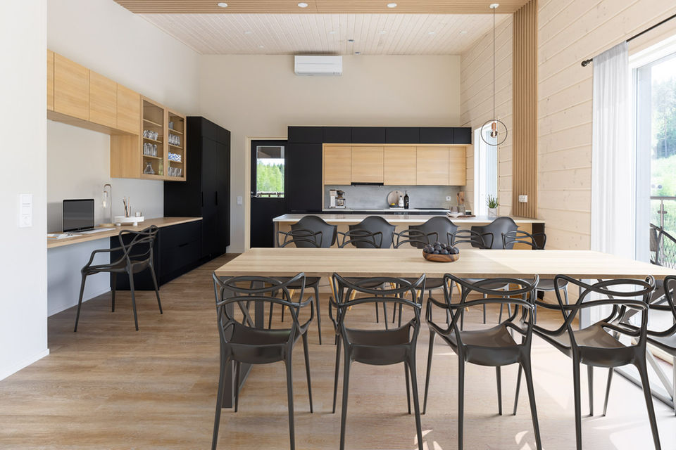 Pääkerros: Avarassa olohuoneessa on korkea katto, suuret ikkunat ja upea takka, jotka luovat täydellisen paikan rentoutumiseen ja viihtymiseen. Moderni avokeittiö on varusteltu laadukkailla kodinkoneilla ja ruokailutilassa on tilaa suuremmallekin seurueelle.